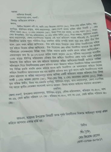 ভুক্তভোগী ফিরোজ হোসেনের জানান, তফসিল বর্নিত সম্পত্তি কবলা সূত্রে প্রাপ্ত হইয়া দীর্ঘ দিন যাবৎ ভোগ দখল করিয়া আসছে। এমত অবস্থায় বিবাদী উপজেলা বিএনপির সাধারণ সম্পাদক আব্দুল মতিন দলীয় প্রভাব প্রতিপত্তি খাটিয়ে পূর্ব বিরোধের জের ধরে মহাদেবপুর, ইউনিয়ন-হাতুড়, মৌজা-মহিষবাথান, খতিয়ান নং-৪০০, দাগ নং-২৬, মোট জমির পরিমান ২৭ ডেঃ। খতিয়ান নং-৪০০, দাগ নং-১২৫, মোট জমির পরিমান ৪০ ডেঃ জমি জোর পূর্বক দখল চেষ্টা মারপিট ও হত্যার হুমকি প্রদান করিতে থাকে।