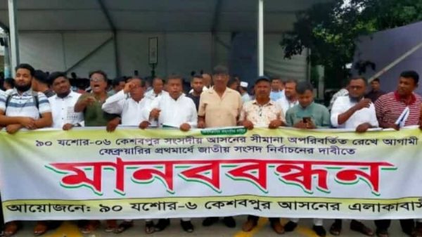 পরেশ দেবনাথ, কেশবপুর, যশোর।।বিক্ষোভ মিছিল নিয়ে নির্বাচন অফিস ঘেরাও এবং স্মারকলিপি দিয়েছে যশোর-৬ কেশবপুর আসনের ভোটাররা। যশোর-৬ আসনের সীমানা অপরিবর্তিত