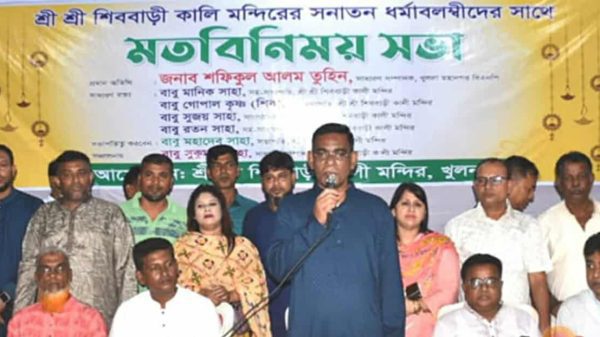 অদিতি সাহা,খুলনার খবর।।নগরীর শিববাড়ি মোড়ে শ্রীশ্রী কালী মন্দিরের সনাতন ধর্মাবলম্বীদের সাথে শুক্রবার সন্ধ্যায় মতবিনিময় করেছেন খুলনা মহানগর বিএনপি’র সাধারণ সম্পাদক