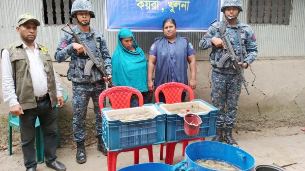কয়রায় নৌবাহিনীর যৌথ অভিযানে অবৈধভাবে জেলি পুশ করে ওজন বৃদ্ধি করা চিংড়ি আটক