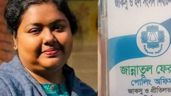 খুলনার খবর || জাহাঙ্গীর নগর বিশ্ববিদ্যালয় ছাত্রসংসদ (জাকসু) নির্বাচনে ভোট গণনা সংক্রান্ত কার্যক্রমে অংশ নিতে এসে প্রীতিলতা হলের জান্নাতুল ফেরদৌস