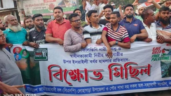 ফিলিস্তিনিদের উপর ইসরাইলি বাহিনীর হামলার প্রতিবাদে লোহাগড়ায় বিক্ষোভ মিছিল ও সমাবেশ অনুষ্ঠিত