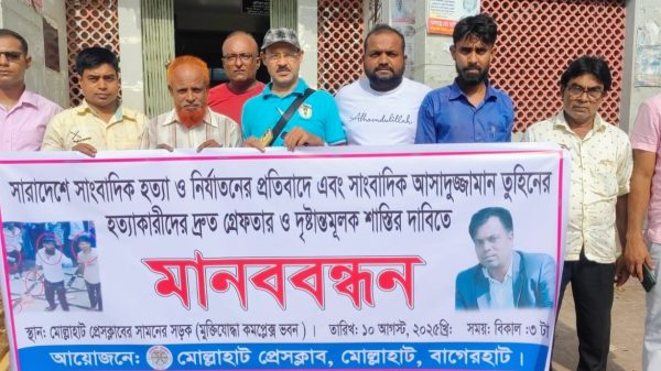 আরিফুল ইসলাম রিয়াজ, মোল্লাহাট, বাগেরহাট।। গাজিপুরে চাঞ্চল্যকর সাংবাদিক আসাদুজ্জামান তুহিন হত্যাকান্ডের প্রতিবাদে মোল্লাহাট প্রেসক্লাবের পক্ষ থেকে মানববন্ধন কর্মসূচি পালিত হয়েছে।
