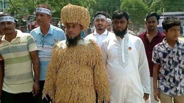 খুলনার খবর ||তীব্র গরমে ঘামে ভিজে গেছে শরীর। এর মধ্যে সারা শরীরে ধান দিয়ে তৈরি পোশাক পরে স্লোগান দিচ্ছেন এক