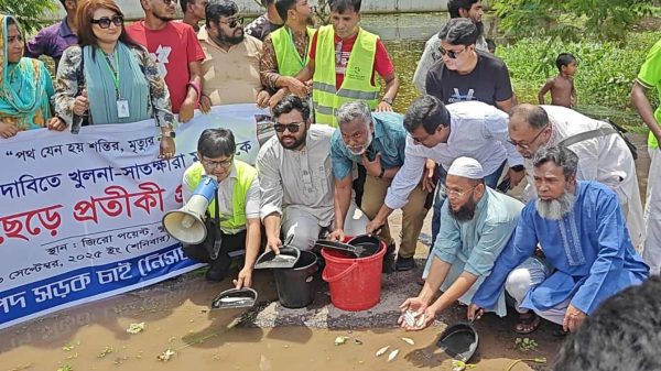 খুলনা- সাতক্ষীরা মহাসড়কে মাছ ছেড়ে নিসচা,র প্রতীকী প্রতিবাদ